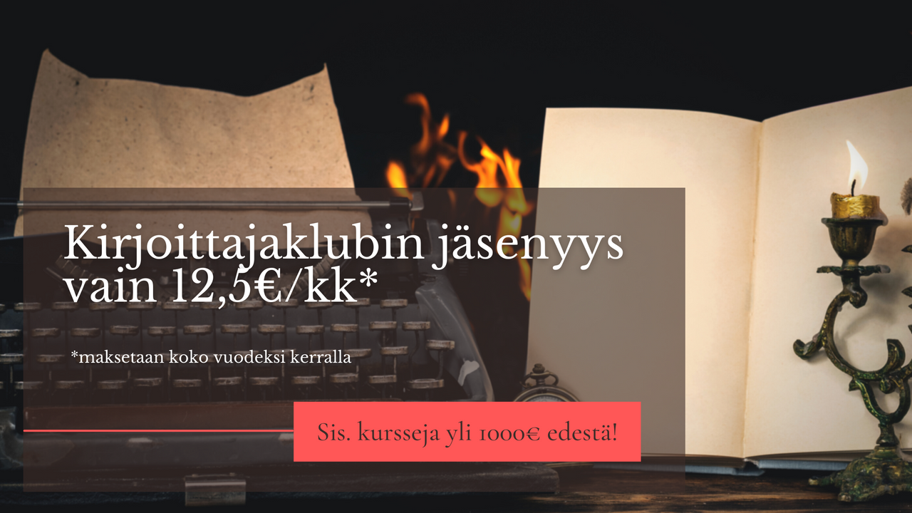 - Kirjoittajaklubin vuosijäsenyys / Kirjoittajan vuosi NYT VAIN 150€ koko vuosi // Etusi reilusti yli 1.000 euroa! **